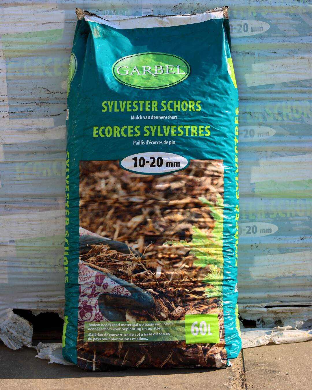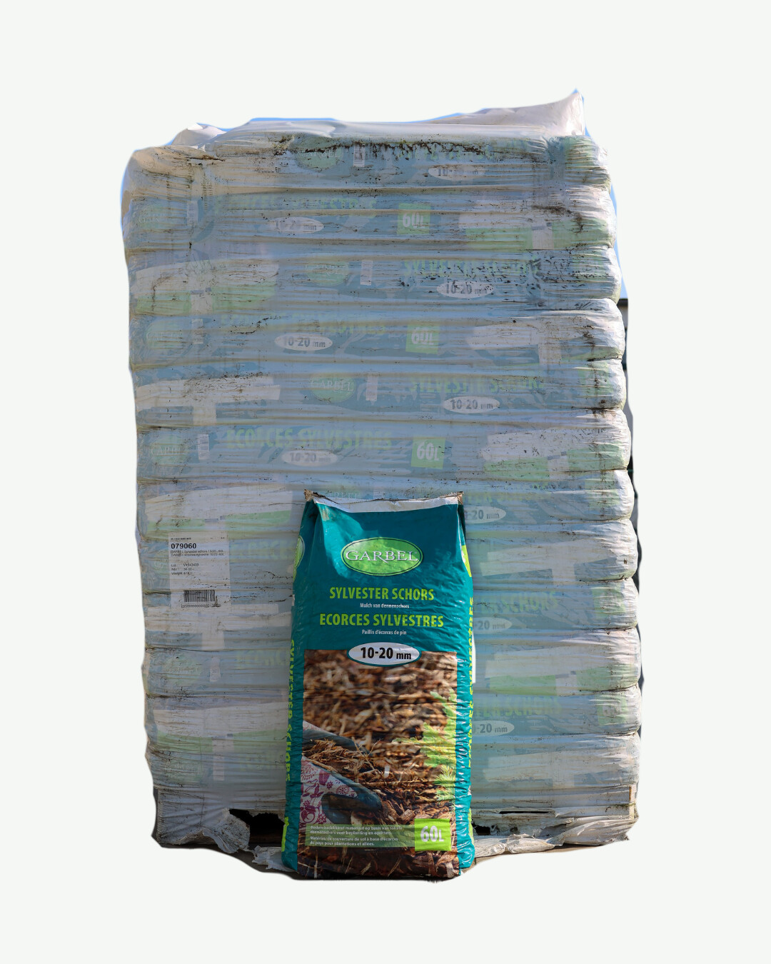 Wij plaatsen de pallet op de gewenste locatie met een kooi-aap. De levering blijft netjes verpakt waardoor de schors niet overal rondslingert. 1 pallet bevat 36 zakken van 60L.